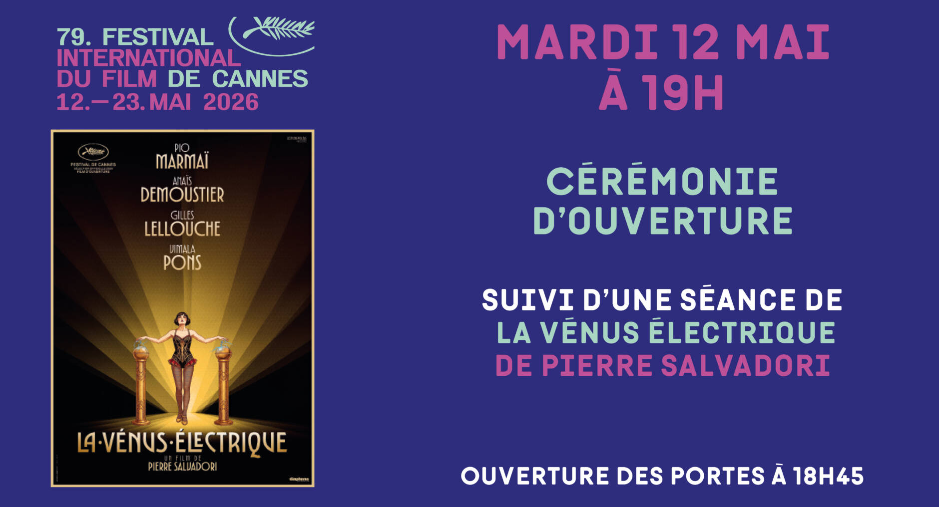la Cérémonie d’Ouverture et le film d’ouverture, mardi 12 mai à 20h.